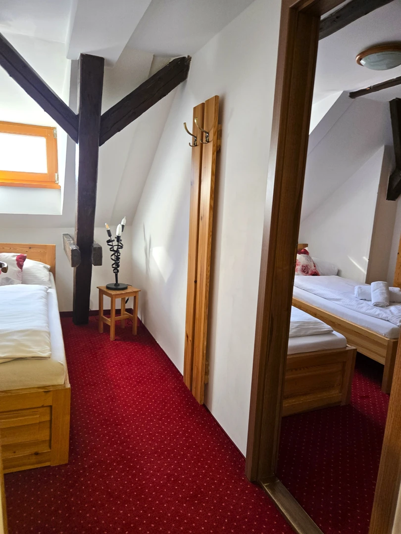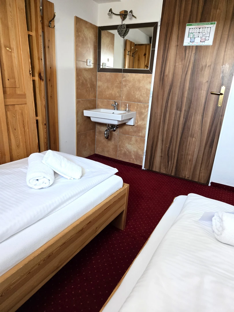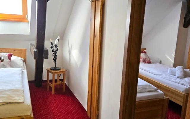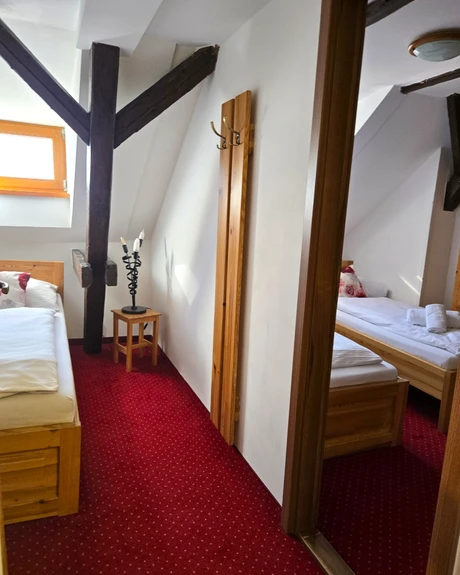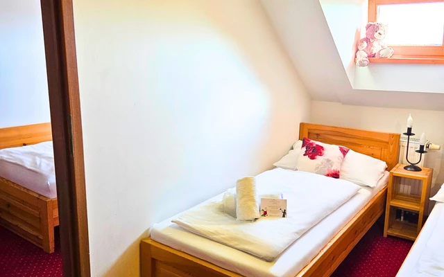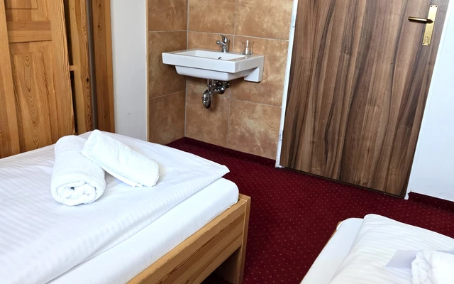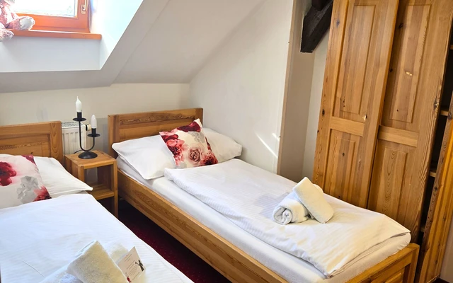 The room is divided into two smaller cosy rooms – the first with a double bed and the second with a single bed, ensuring a peaceful rest after a day full of adventures. The room also includes a washbasin. Toilet facilities are shared on the floor.