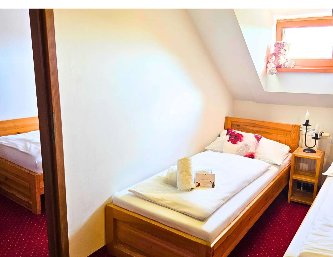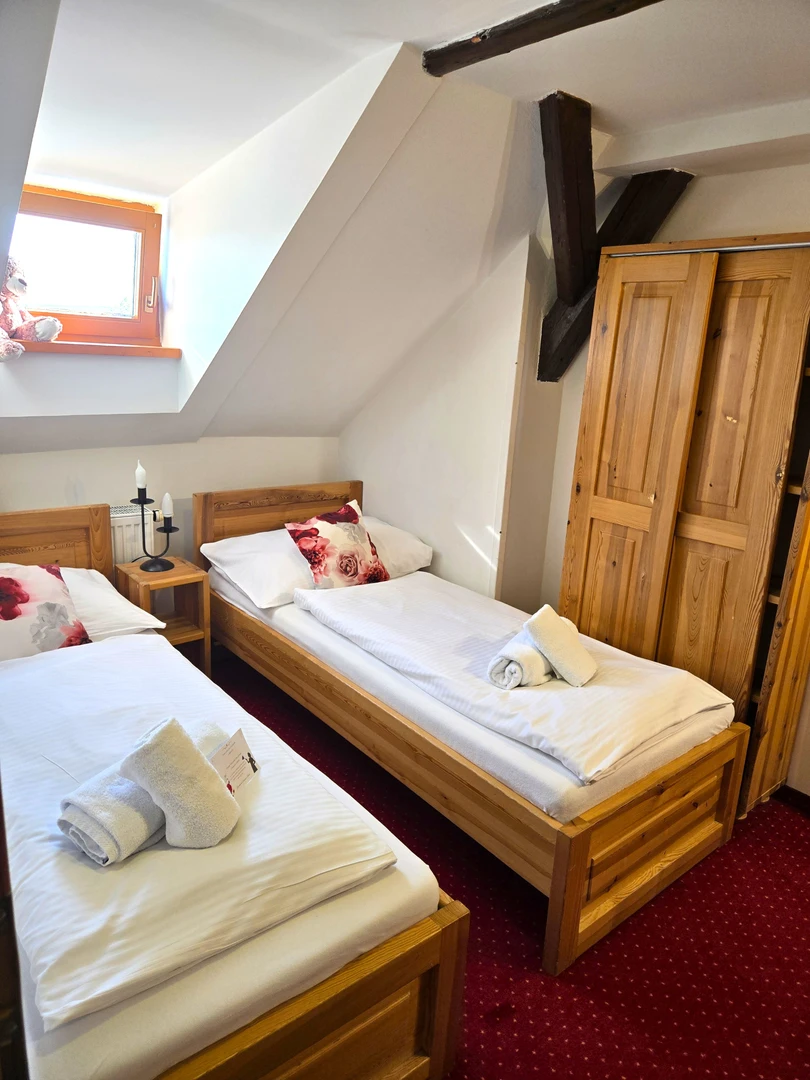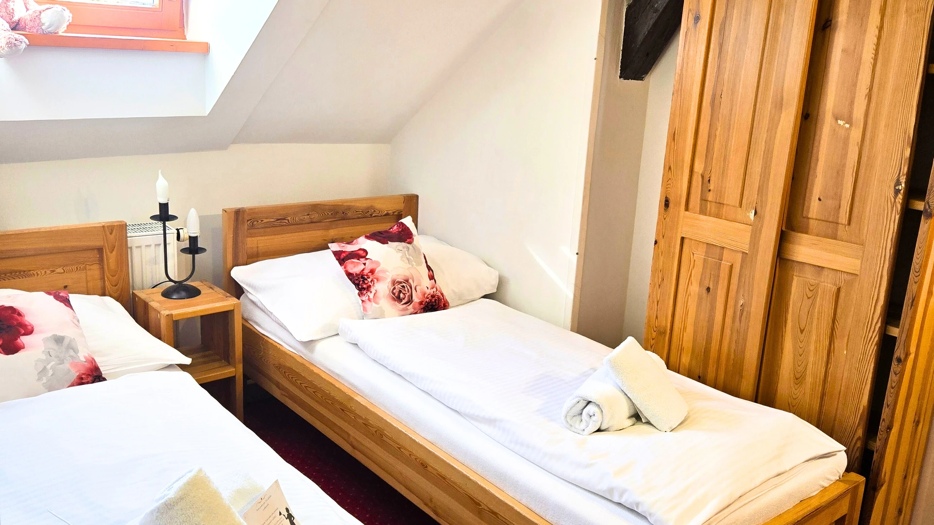 The room is divided into two smaller cosy rooms – the first with a double bed and the second with a single bed, ensuring a peaceful rest after a day full of adventures. The room also includes a washbasin. Toilet facilities are shared on the floor.